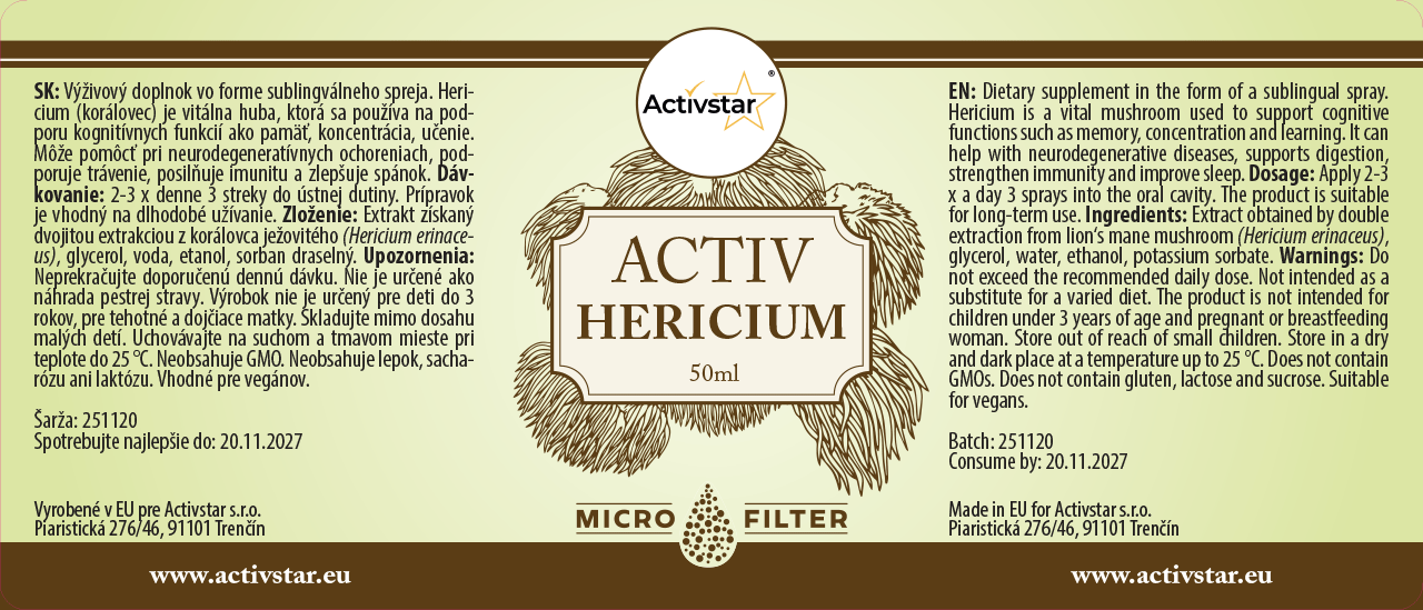 Activ Hericium is a nutritional supplement in the form of a sublingual spray, which contains an extract from the vital mushroom Hericium erinaceus (hedgehog coral). Thanks to the unique double extraction technology, it ensures maximum effectiveness and rapid absorption directly through the mucous membrane.