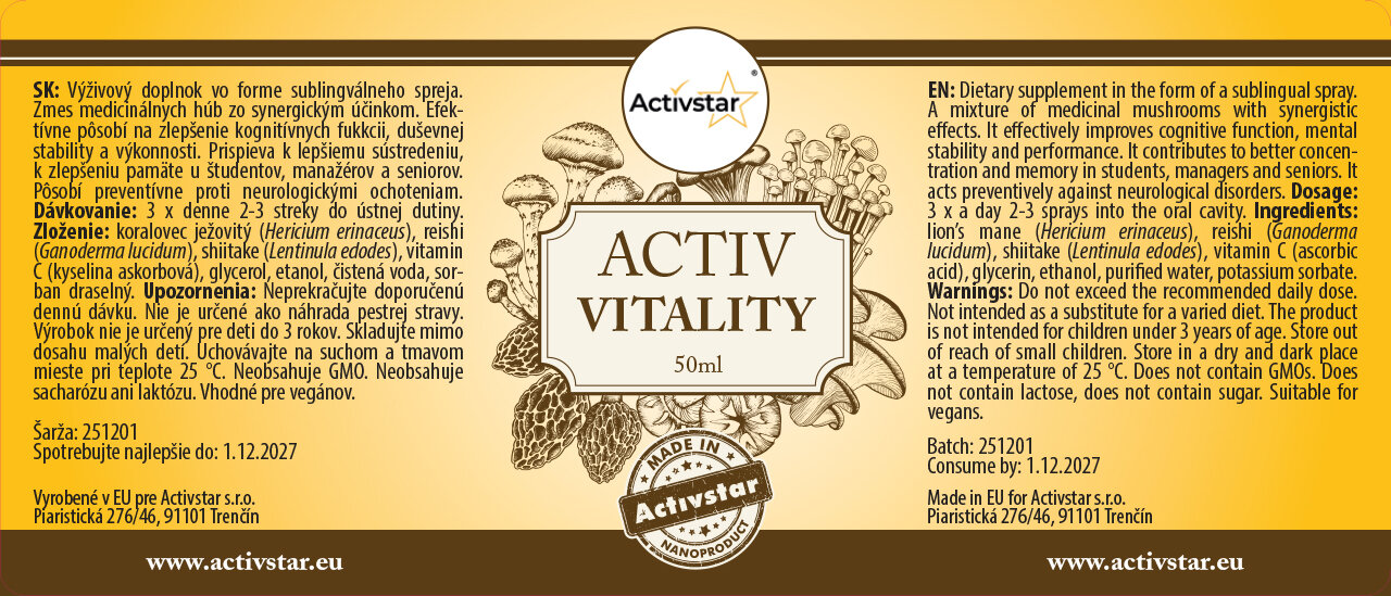 ACTIV VITALITY to suplement diety w postaci podjęzykowego sprayu, który łączy w sobie moc grzybów leczniczych z synergicznym działaniem. Wspomaga funkcje poznawcze, koncentrację, pamięć i sprawność umysłową. Jest idealny dla studentów, kadry kierowniczej, seniorów i każdego, kto chce zwiększyć witalność i odporność psychiczną.